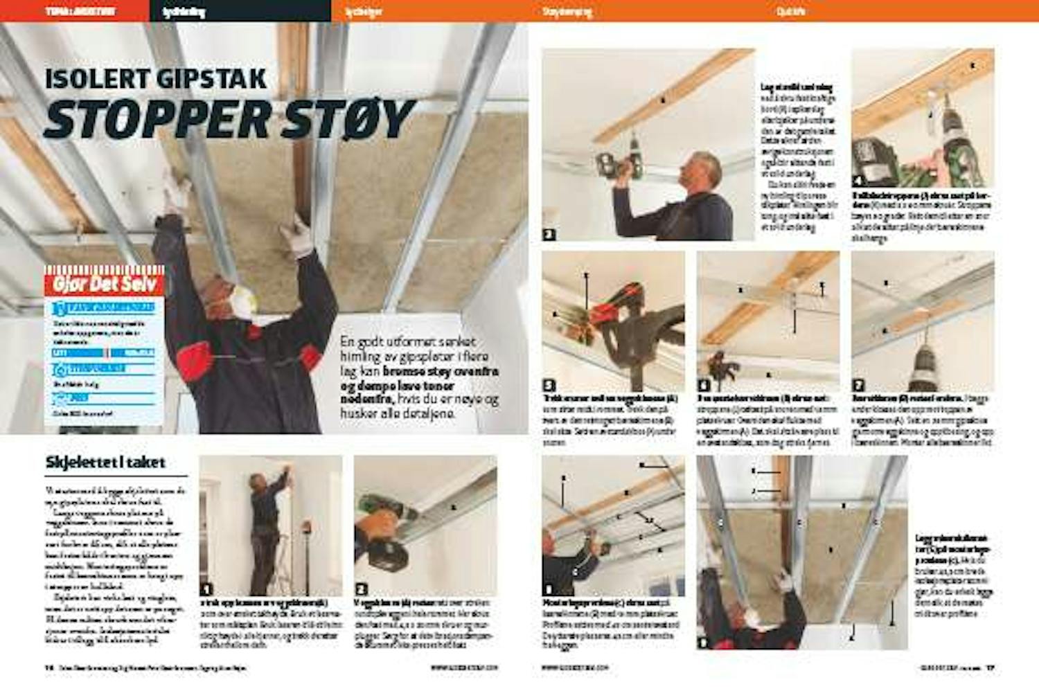 En lufttett elastisk fugemasse legges langs kanten av taket for at luftbåren lyd ikke kan finne veien ned ovenfra. I tillegg kan hulrommet over isolasjonen også dempe dype lyder i rommet.