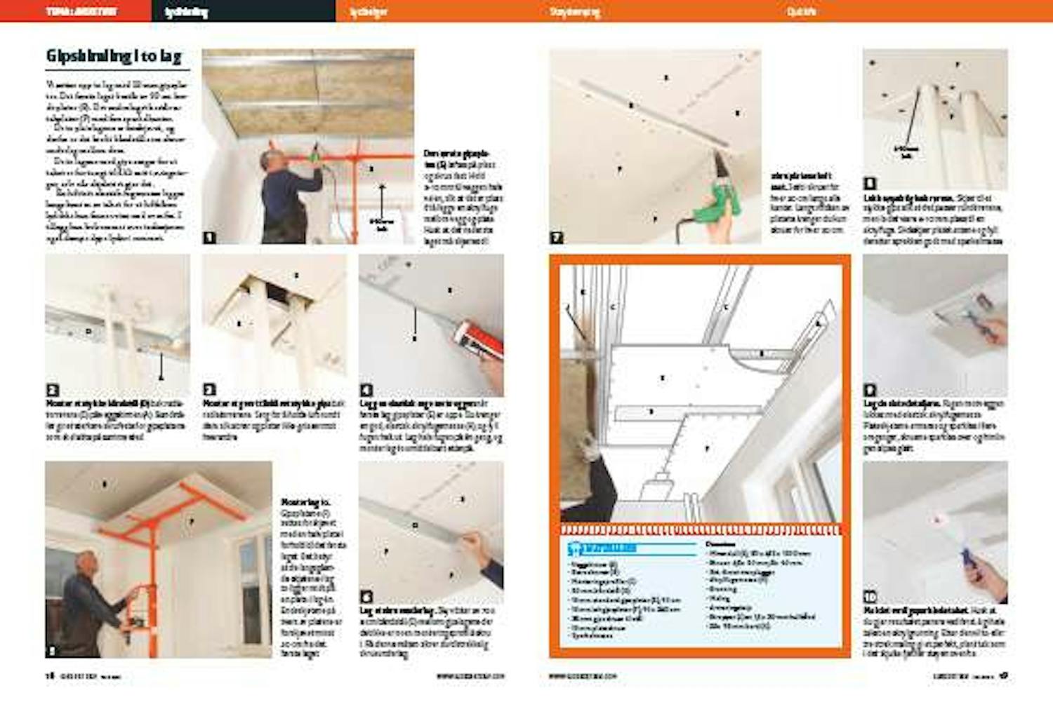 Lag de siste detaljene. Fugen mot veggen lukkes med elastisk akrylfugemasse. Plateskjøtene armeres og sparkles i flere omganger, skruene sparkles over og himlingen slipes glatt.