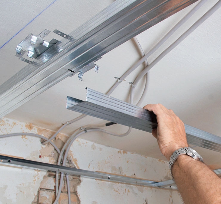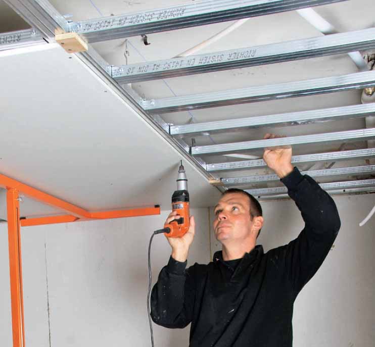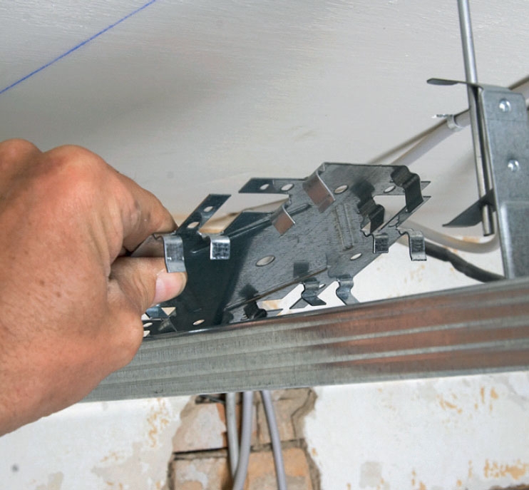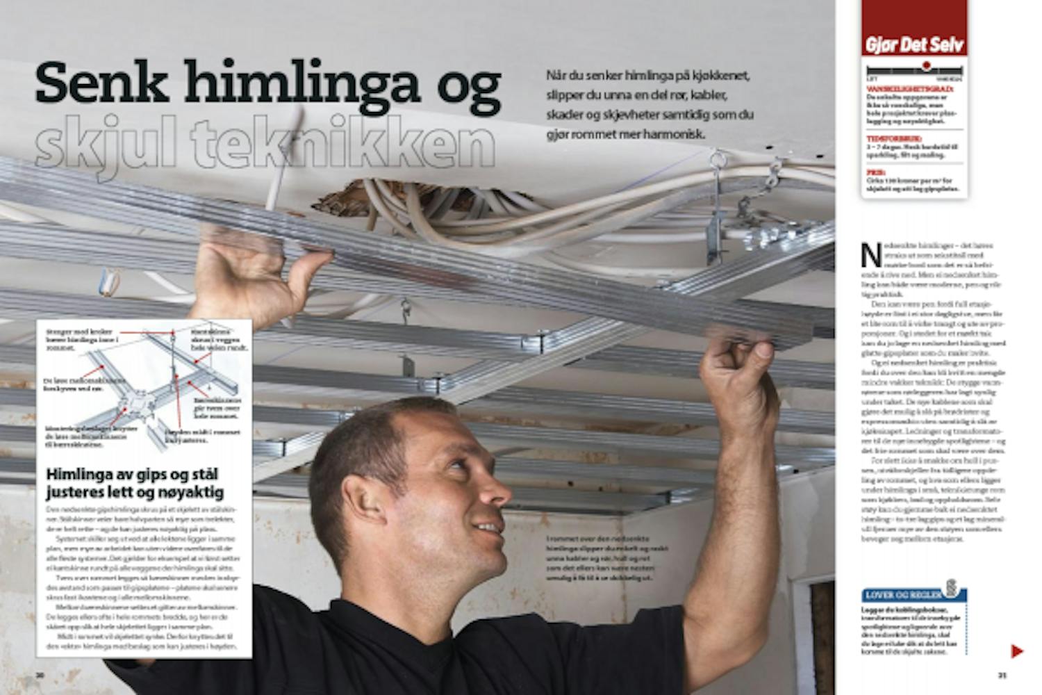 Dersom den nedsenkte himlinga også skal isolere mot støy, setter du på to eller tre lag gipsplater og mineralull oppå stål-skjelettet, men ellers er et lag plater nok.