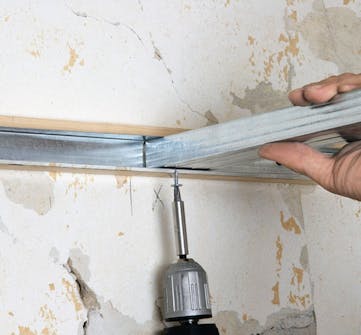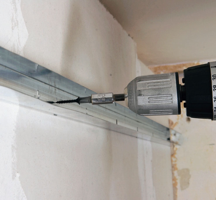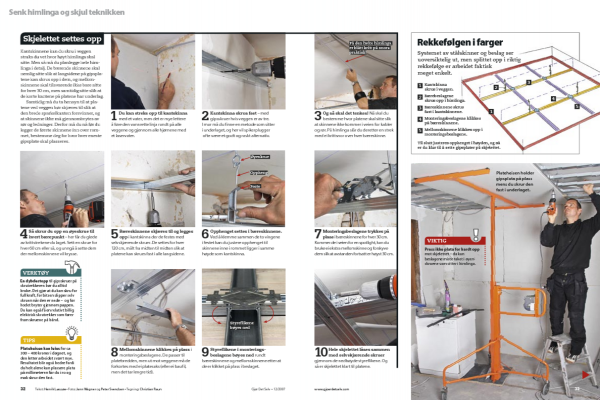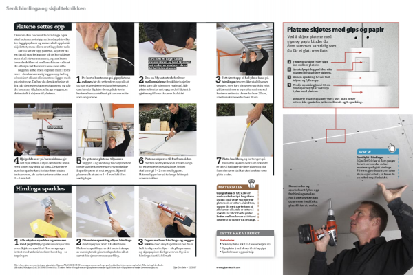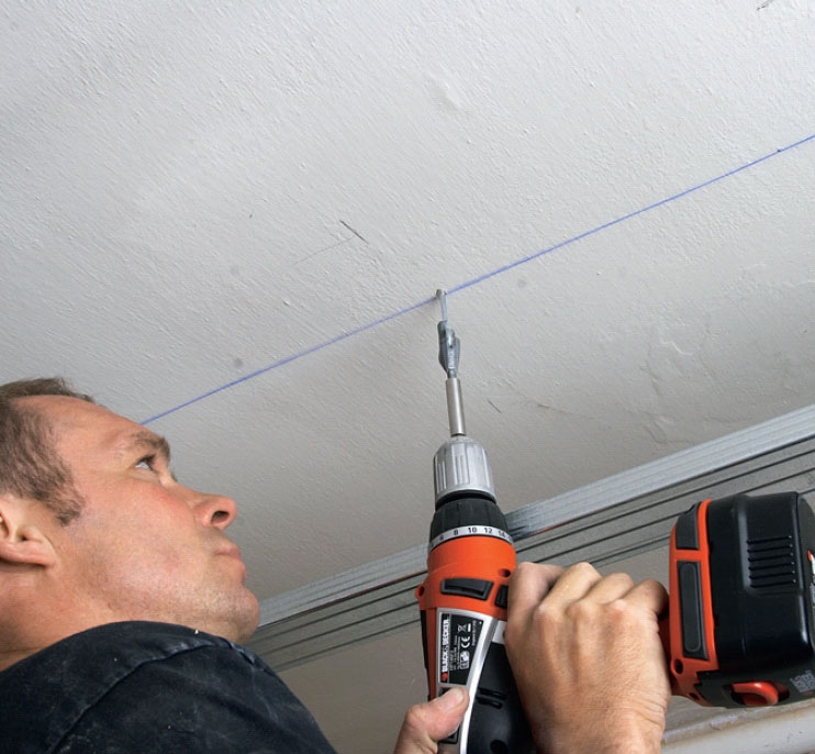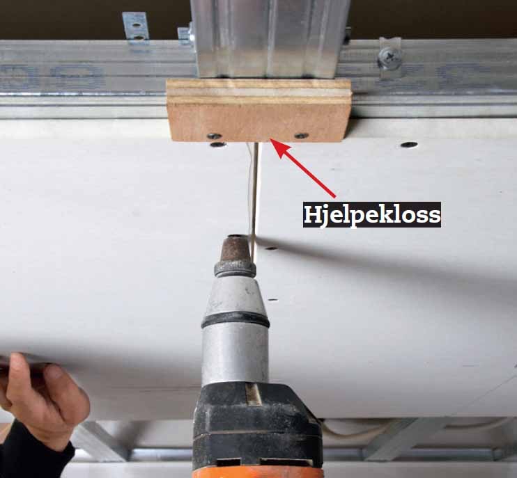 Sett først opp ei hel plate inne på himlinga der den ikke skal tilpasses veggen, men kan plasseres nøyaktig midt på bæreskinnene og mellomskinnene. I kantene setter du skruer for hver 20 cm, i mellomskinnene for hver 30 cm.
