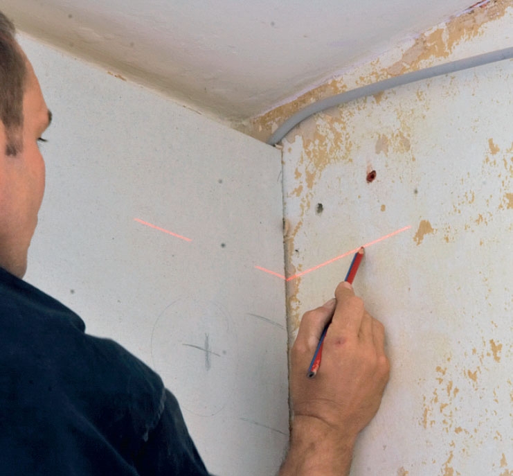 Du kan streke opp til kantskinna med et vater, men det er mye lettere å føre den vannrette linja rundt på alle veggene og gjennom alle hjørnene med et laservater.