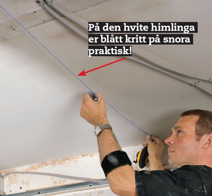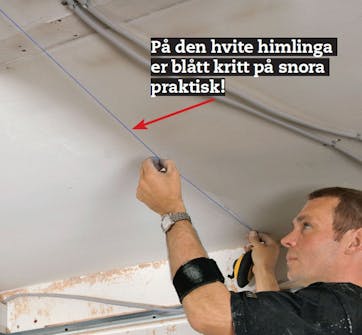 Og så skal det tenkes! Nå skal du bestemme hvor platene skal sitte slik at skinnene ikke kommer i veien for kabler og rør. På himlinga slår du deretter en strek med ei krittsnor over hver bæreskinne.