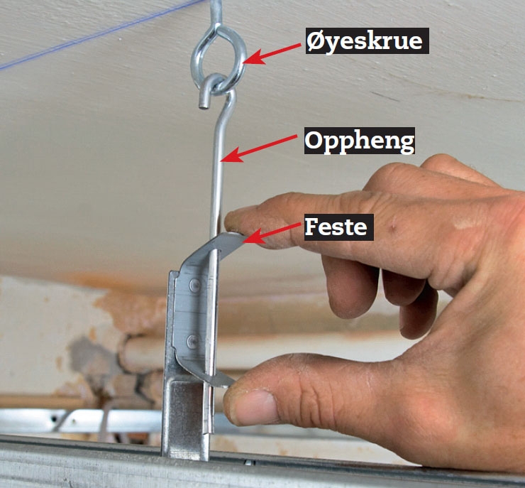 Så skrur du opp en øyeskrue til hvert bærepunkt - her får du glede av krittstrekene du laget. Sett en skrue for hver 60 cm eller så, og unngå å sette dem der mellomskinnene vil krysse.