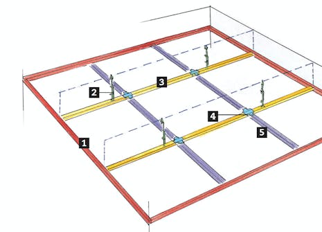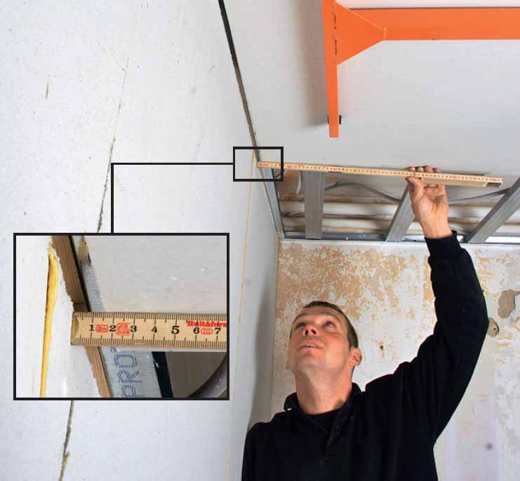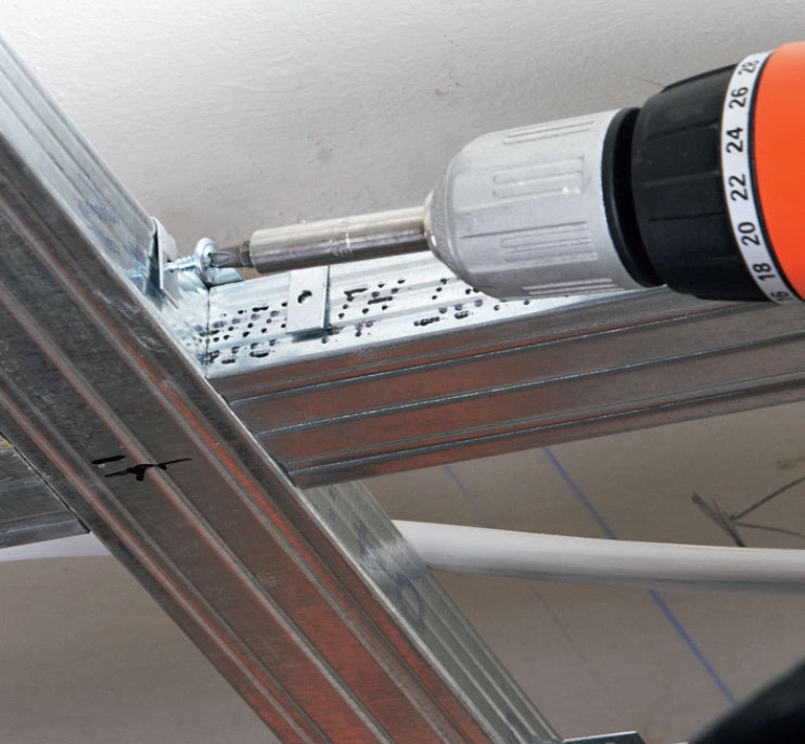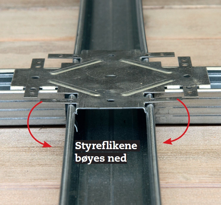 Kantskinnene kan du skru i veggen straks du vet hvor høyt himlinga skal sitte. Men så må du planlegge hele him-linga i detalj. De bærende skinnene skal nemlig sitte slik at langsidene på gipspla-tene kan skrus opp i dem, og mellom-skinnene skal tilsvarende ikke bare sitte for hver 30 cm, men samtidig sitte slik at de korte kantene på platene har underlag.