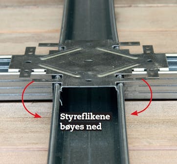 Styreflikene i monterings-beslagene bøyes ned rundt bæreskinnene og mellomskinnene etter at de er klikket på plass i beslaget.