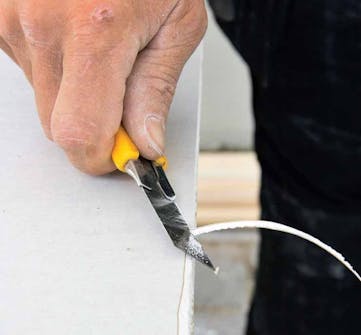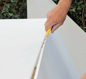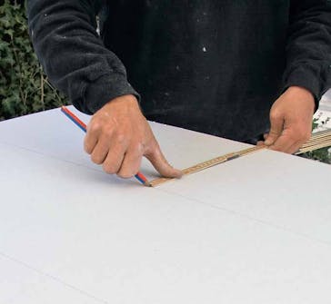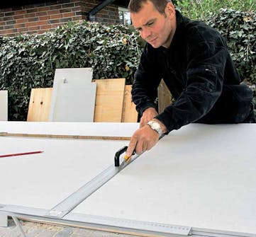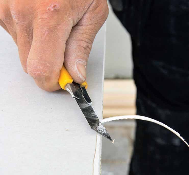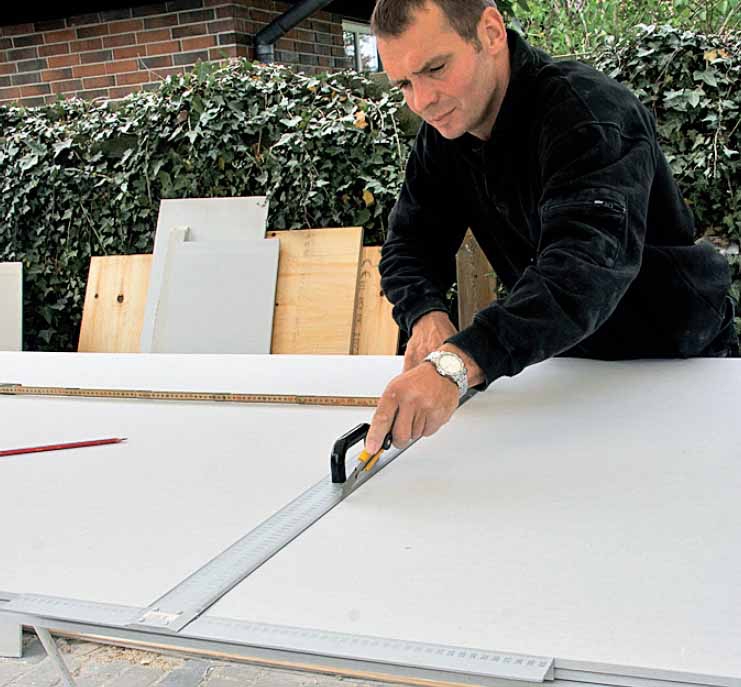 Før du setter opp platene, skjærer du en fas til sparkelmasse på de kortsidene som skal støtes sammen, og markerer hvor de dekker ei mellomskinne - slik at du etterpå vet hvor skruene skal sitte.
