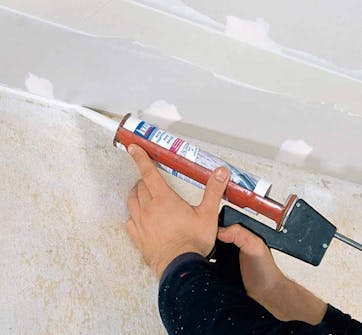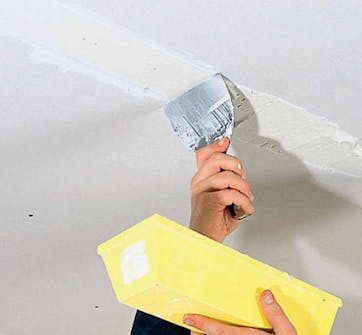De korte kantnene på gipsplatene avfases før du setter dem opp slik at du kan skjøte dem med sparkelmassen. I dag kan du få plater der også de korte kantene har sparkelkant på samme måte som langsidene.