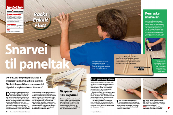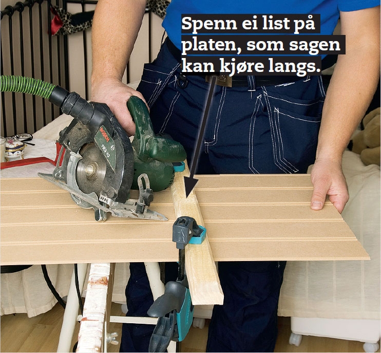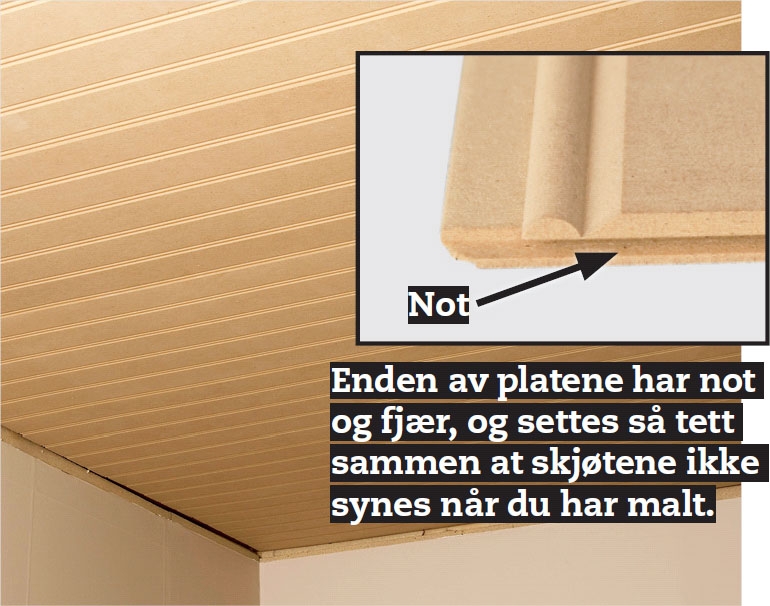 Mål opp taket, og husk at det sikkert er litt skjevt. Er det tilfellet, så er det ofte en fordel å fordele skjevheten på begge sider. Tegn gjerne en plan over hvordan du vil kutte de 239 cm lange platene, slik at endeskjøtene ikke kommer på linje.