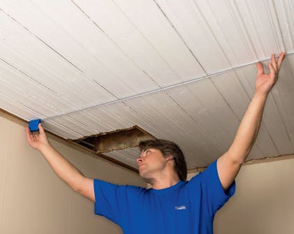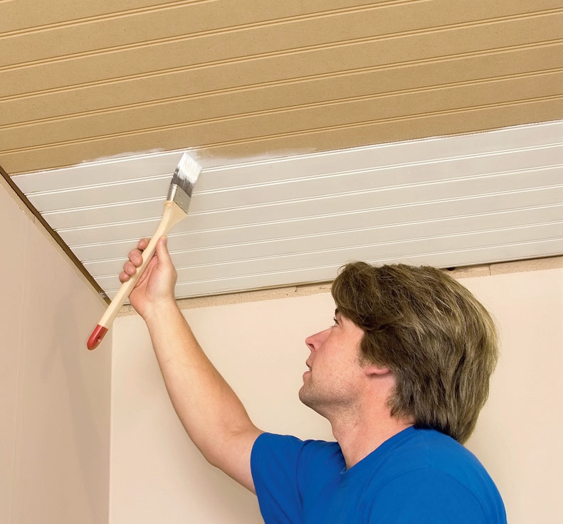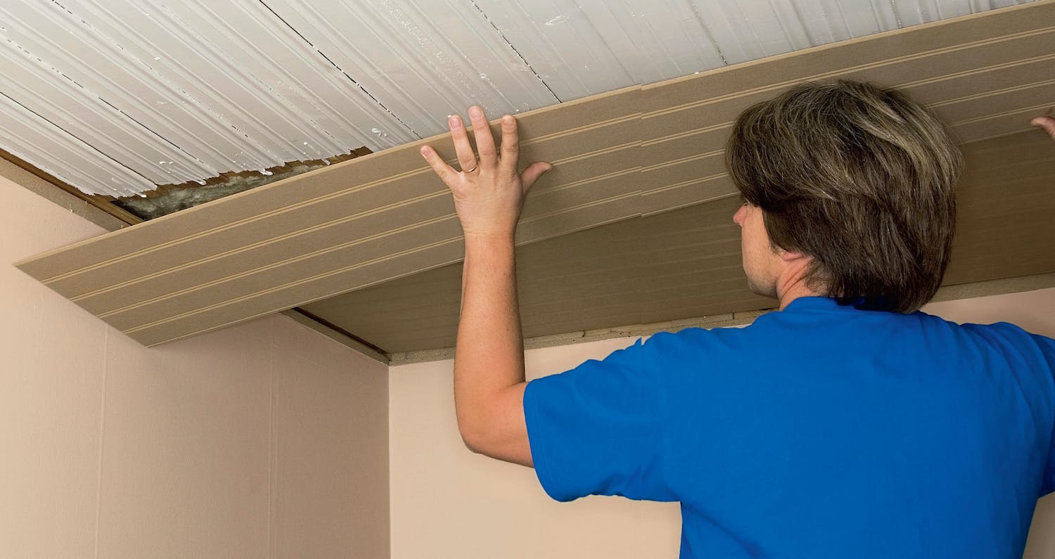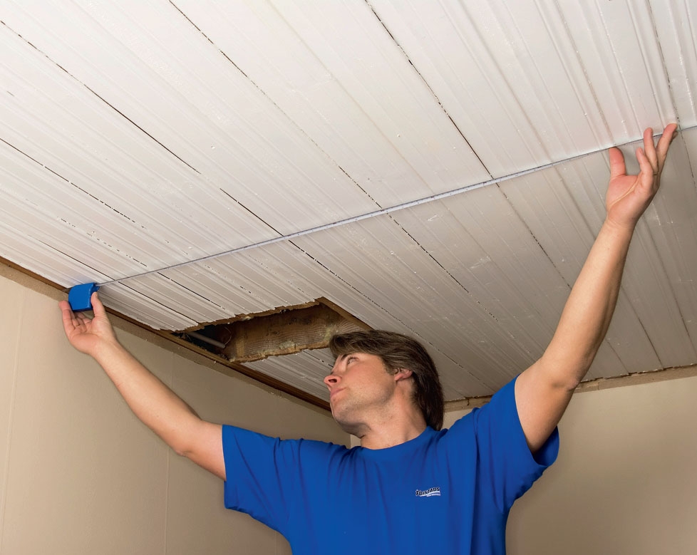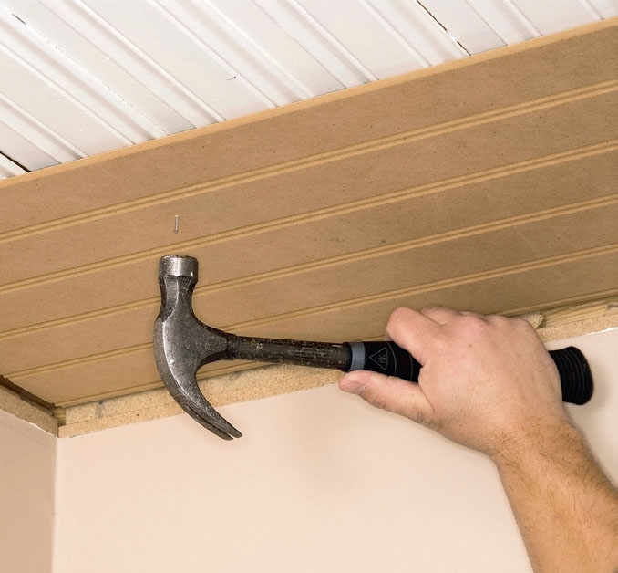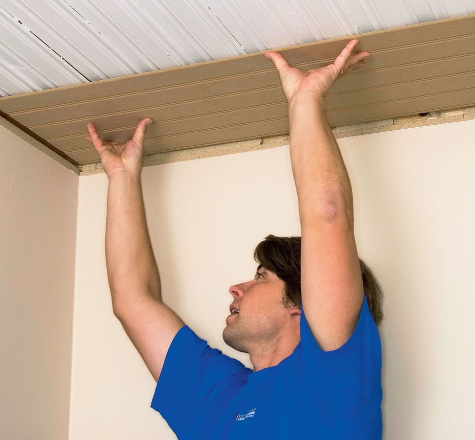 Platen settes på plass og presses opp. Her er det greit å være to om jobben, ingen tvil om det. Arbeider du alene, kan du få hjelp av en støttebjelke, som du skjærer litt lengre enn takhøyden, og monterer en tverrlekt på i begge ender.