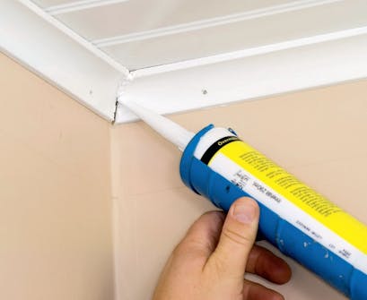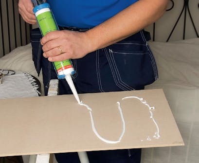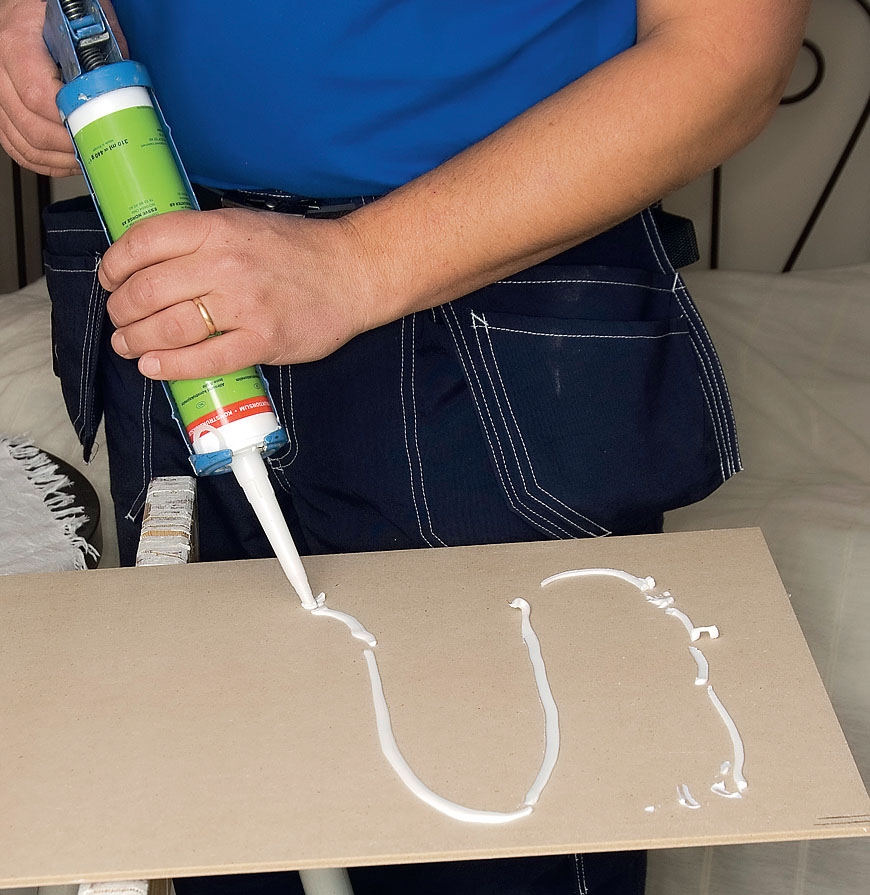 En stripe montasjelim trekkes ut på platens bakside. Det skal være en limtype som holder, selv om stripen bare er et par millimeter tykk. Og den selvsagt skal være av en type som binder begge materialene som skal limes.