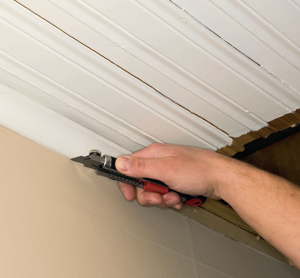 Med en skarp kniv skjærer vi gennom tapeten og all maling langs kanten av taklisten, så vi ikke risikerer at det løsner og følger med taklista. Poenget er å bli ferdig med prosjektet i en fart, ikke å pusse opp hele rommet.