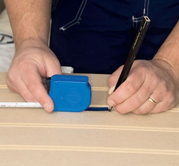 Vi markerer på platen, der vi vil skjære. Et målebånd som kan låses fast er greit å ta innvendige mål med. Låser du båndet i riktig lengde, så kan du merke platen uten å måtte lese av tallverdien for hver strek du setter av.