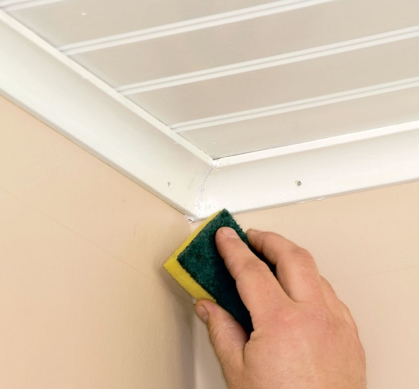 Så setter vi taklister på plass, etter at de også har fått litt frisk maling. Om det blir noen sprekker og hull, så går du over med en akrylfug.