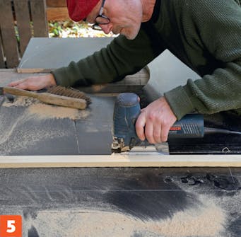 For at grunningen skal hefte godt, mattslipes den glatte overflaten med en eksentersliper med korn 60. Fordi 5-tallet skal skrus fast på husveggen, borer vi også fire hull, som undersenkes.
