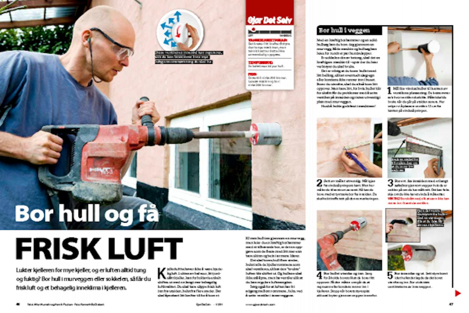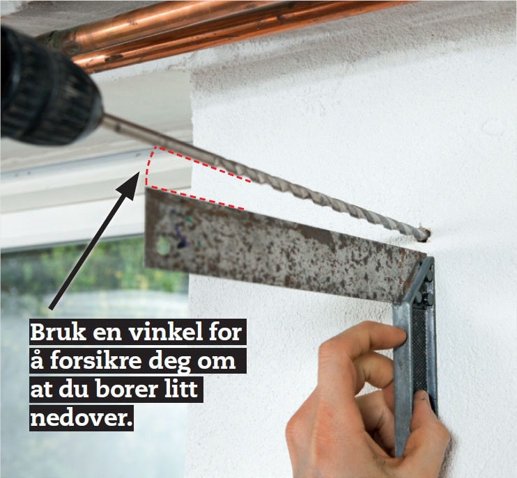 Det er viktig at du borer hullet med litt helling, slik at eventuelt slagregn eller kondens ikke renner inn i huset. Borer du utenfra, skal du altså bore litt oppover. Men bare litt, for hvis hullet blir for skrått får du problemer med å sette ventilen på innsiden og risten utvendig i plan med murveggen.