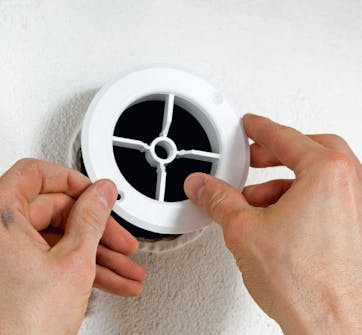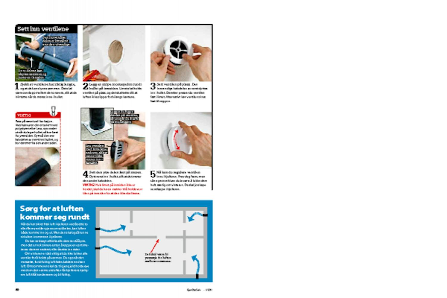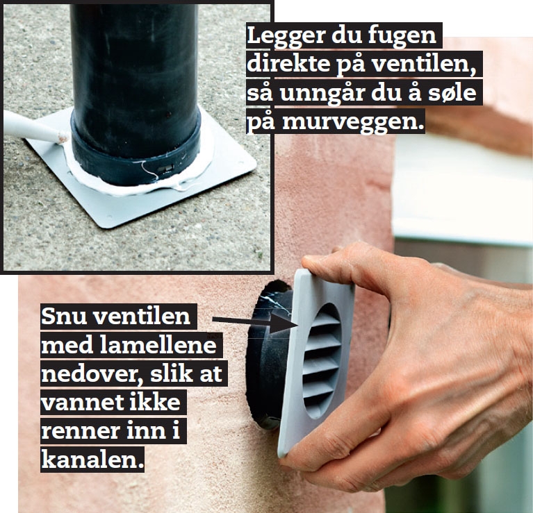 Sett ventilen på plass. Den innvendige halvdelen av røret dyttes inn i hullet. Deretter presser du ventilen fast i limet. Alternativt kan ventilen skrus fast til veggen.