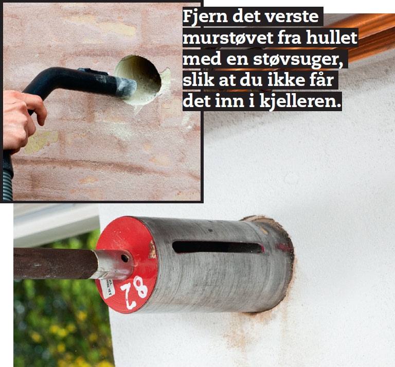 Bor hullet utenfra og inn. Sørg for å holde boret slik at du borer litt oppover. På den måten unngår du at regnvann eller kondens renner inn i kjelleren. Stopp når borets styrespiss akkurat bryter gjennom veggen innenfor.