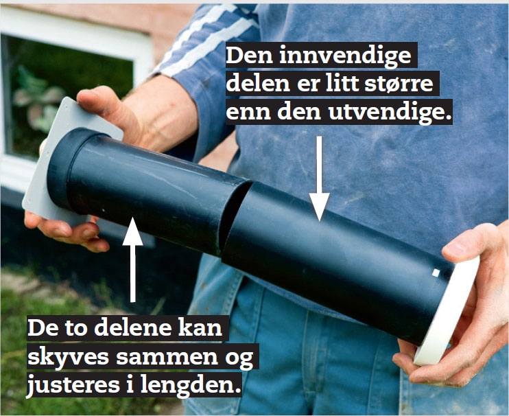 Sjekk at ventilene har riktig lengde, og at de kan skyves sammen. Det skal være overlapp mellem de to rørene, slik at de blir tette når de møtes inne i hullet.