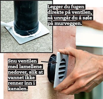 Sett den ytre delen fast på muren. Dytt røret inn i hullet, slik at det møter den andre halvdelen. VIKTIG! Hvis limet på innsiden ikke er herdet, skal du ha en makker til å holde ventilen på innsiden for at den ikke skal løsne.