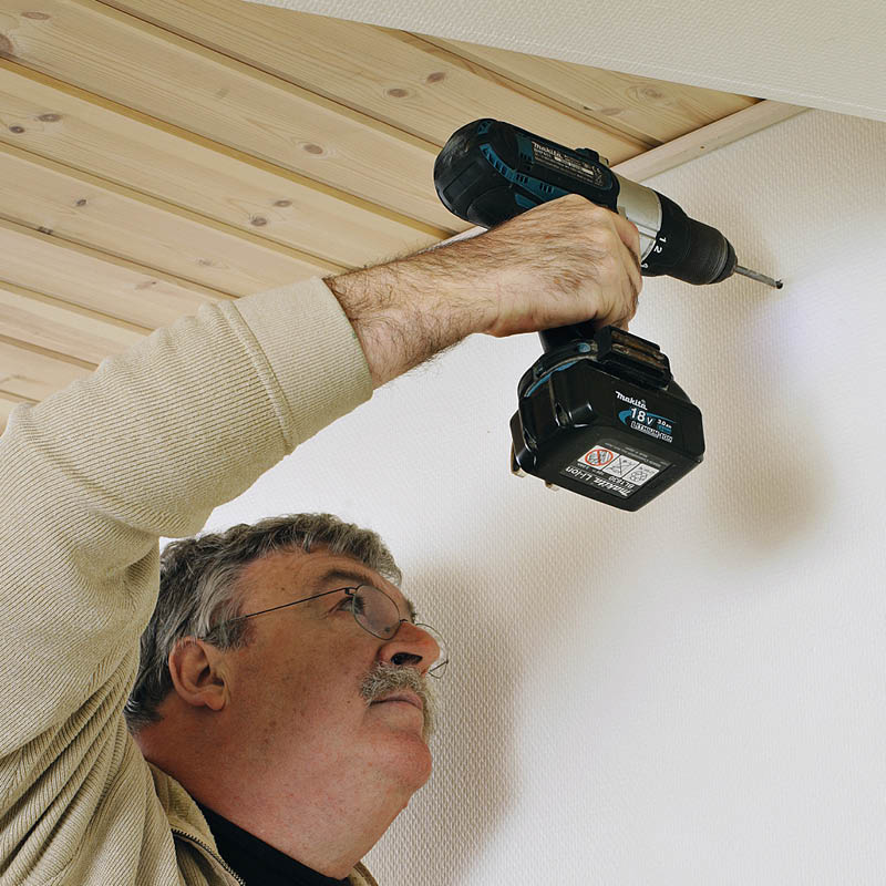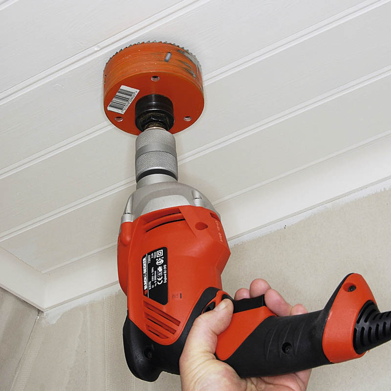 Lag hull til rørgjennomføring fra innsiden. Bruk en hullsag til å lage hull i himlingsplatene og det som eventuelt ligger bak dem.