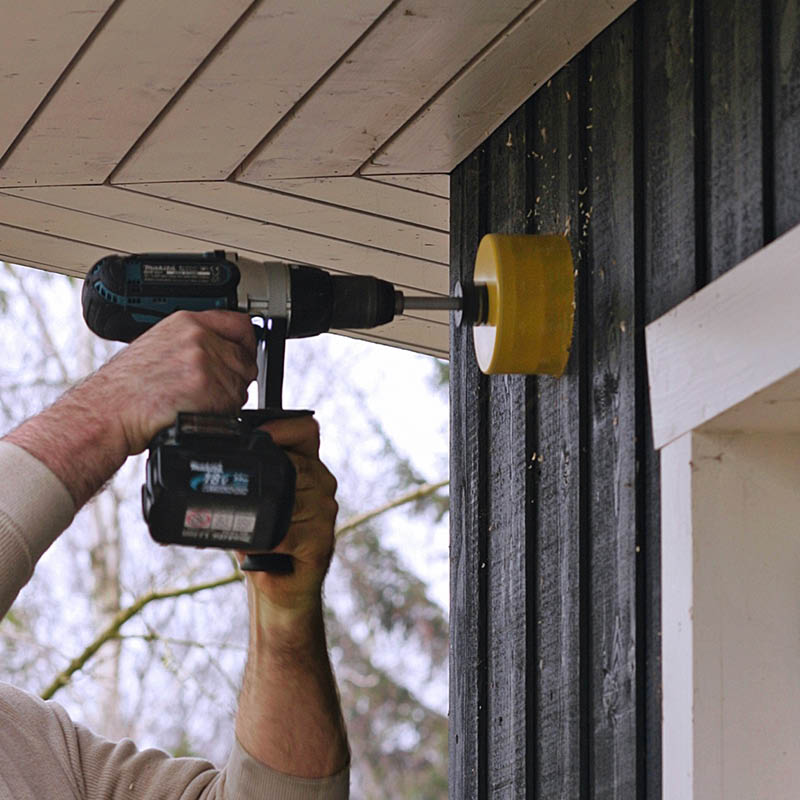 Lag hull i veggen. Bruk en hullsag som passer til ventilasjonsrøret. Hullet skal være sentrert rundt hullet på 4 mm. Bor halvveis gjennom, og gjenta innenfra.