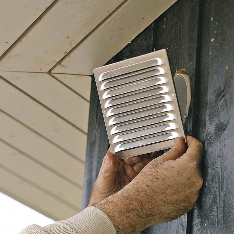 Noe av det enkleste og mest effektive du kan gjøre, er å installere ventilasjonsrister som gjør at luften kan bevege seg rundt i huset uten å måtte åpne dørene først. Ventilasjonsrister er spesielt viktige når du har installert automatiske vifter. De mister nemlig effekt hvis det ikke kommer frisk luft inn. Her har vi montert en rist i en baderomsdør, men de kan også sitte i veggene.