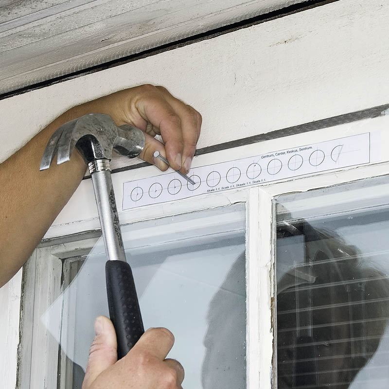 Marker hvor ventilen skal sitte. En mal følger med når du kjøper en spalteventil. Hold den mot vinduet, og bruk en spiker til å markere midten av hullene som skal bores.