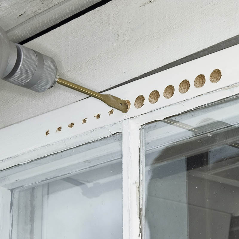 Bor ut hullene. Du skal bruke et spadebor som passer til hullene på malen. Bor forsiktig gjennom vinduet, og stopp når tuppen av boret blir synlig på baksiden. Bor resten av hullet fra baksiden.