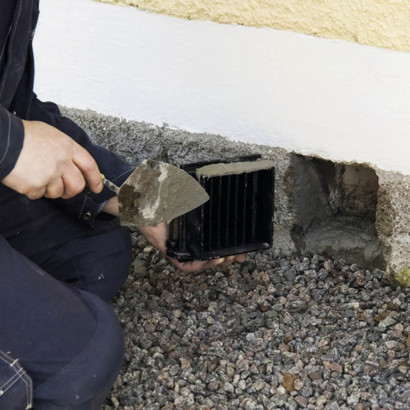 Det skal være åpne ventiler i sokkelen. Hvis de er lukket eller tettet igjen, så skal de åpnes eller erstattes.