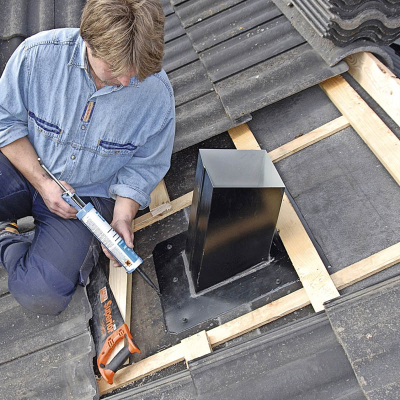 Start ovenfra. Fjern taksteinene, og lag et hull i undertaket på cirka 20 x 20 cm. Monter den indre delen av takhatten direkte på undertaket, og tett igjen slik at undertaket igjen blir helt tett.