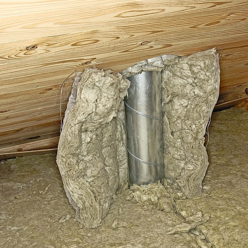 Sett opp avtrekksrøret. Trekk et spirorør, her Ø 100 mm, opp gjennom loftet og ut gjennom taket, slik at det ender under takhatten. Husk å isolere rundt røret på loftet.