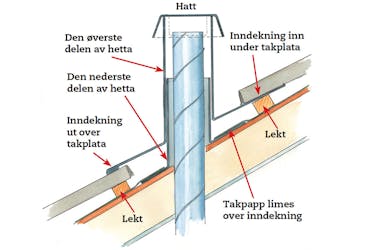 Den nederste delen av takhetta skal festes. Her er det et undertak med takpapp. Ei lekt sages over, den flate kragen på hetta dyttes inn under pappen. Hetta festes med fasadeskruer, pappen limes fast, og lekta spikres på igjen.