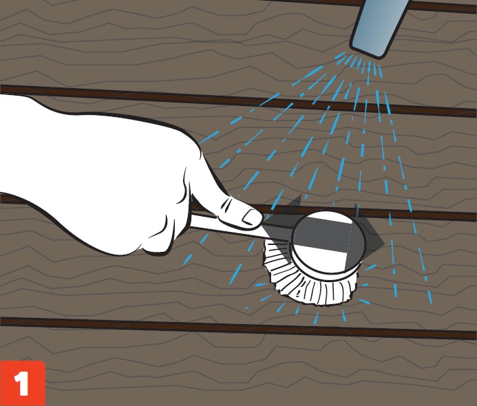 Vask treverket med grunnrens (husvask). Bruk en børste, fjern alle alger mv., og skyll etter med vann. La treverket tørke noen timer etterpå.