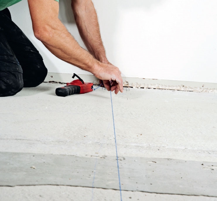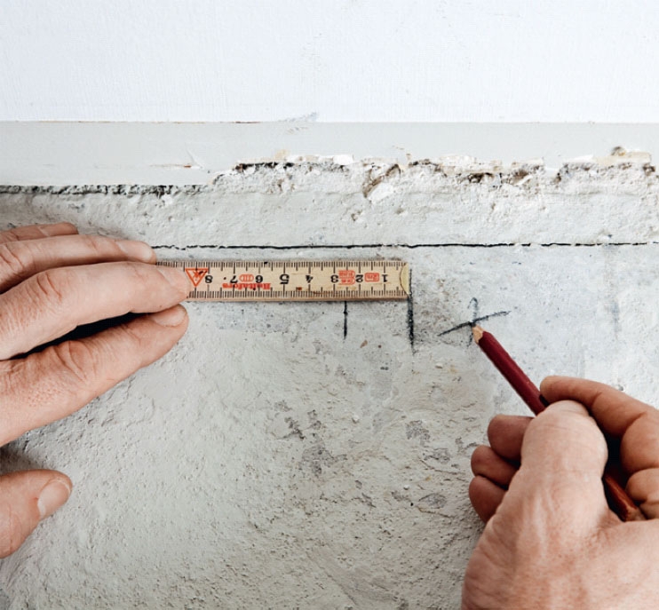 Klipp til veggskinnen i lengden. Den skal mangle 1 cm på å nå taket. Da er det mye enklere å montere den. Sett den i lodd, og fest den for hver 50 cm. Gjør det samme i motsatt ende av rommet, og lag en krittstrek til toppskinnen.