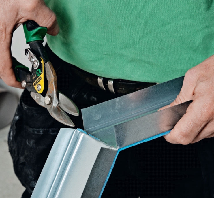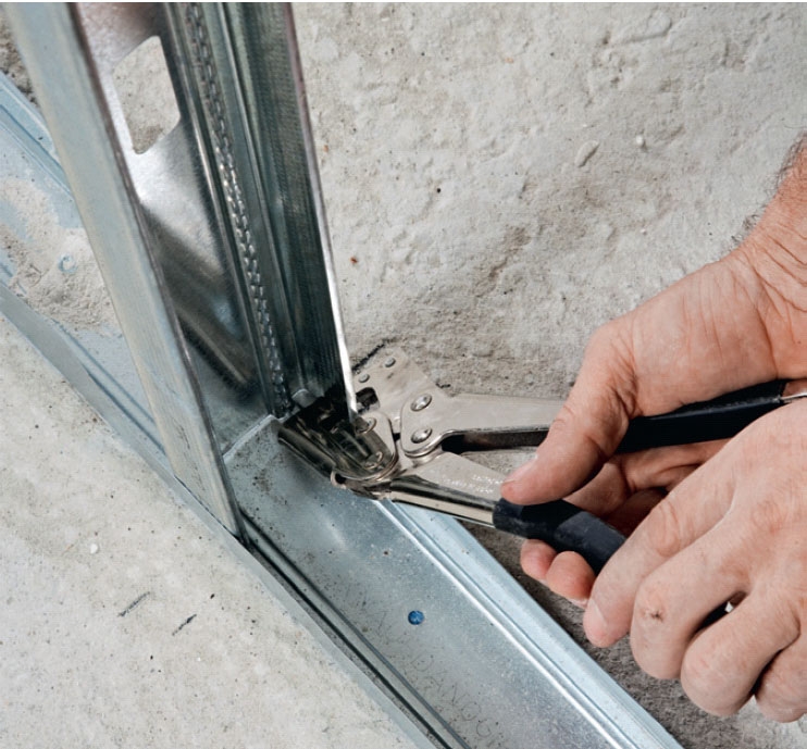 Veggen bygges opp av 70 mm perforerte stålstendere. Her får du bruk for en god platesaks. Har du ikke en platesaks, anbefaler vi at du kjøper eller låner en før du setter i gang med jobben. Du får også bruk for en fiksertang.