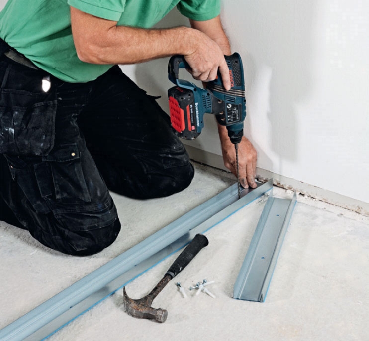 Forbor, og fest bunnskinnen per 50 cm med 5 x 40 mm slagplugger.