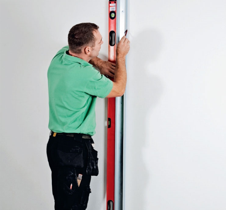 Mål opp, og marker på veggen der første stender skal monteres. Husk å medregne 2 x 13 mm til gips platene på hver side av stenderen.