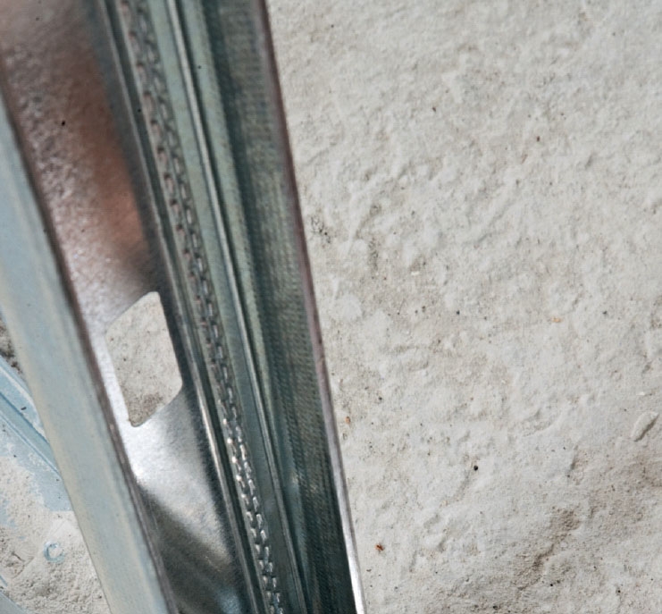 På det første laget gipsplater skal det også være plass til 8-10 mm lydfuge hele veien rundt. Fugematerialet legger vi først i når vi er klare til å montere det andre laget med gips, fordi noen fugematerialer får en litt hard overflate når de størkner, slik at gipsplaten buler litt ut. Derfor monterer vi det andre laget med gipsplater mens fuge materialet er bløtt.