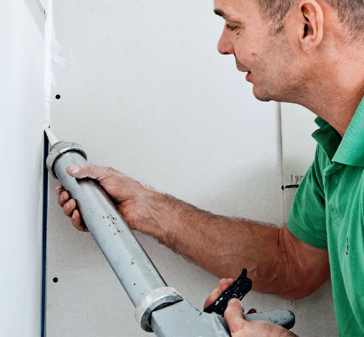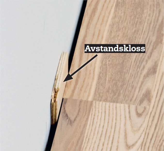 Fyll opp langs gulv, vegger og tak med akrylfugemasse (lydfuge). Skrap av overskytende fugemasse med en sparkel eller noe annet egnet.