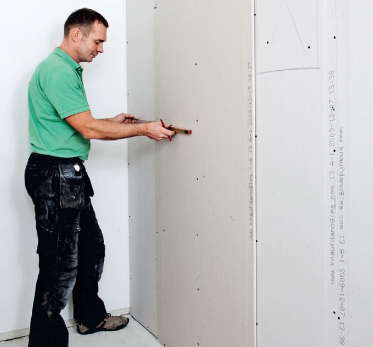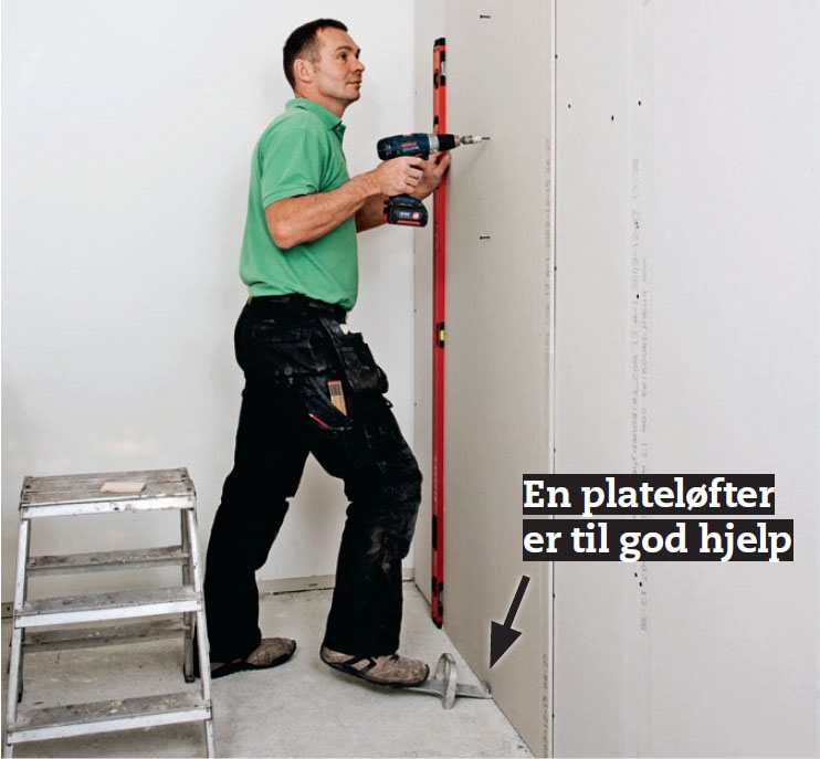 Første lag gipsplater skrus fast med 3,5 x 25 mm gipsskruer. Platene settes på 9 mm klosser på gulvet. Da blir det plass til en lydfuge. Her bruker vi en spesiell bitsforlenger med dybdestopp, slik at skruen ikke skrus for langt inn.