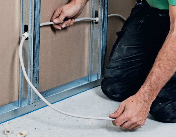 Trekk ledninger (eller elektrikerrør) gjennom hullene i stålstenderne. Sett et stykke flexrør eller elektrikerrør i gjennomføringen, slik at ledningene ikke skades på stålets skarpe kanter.