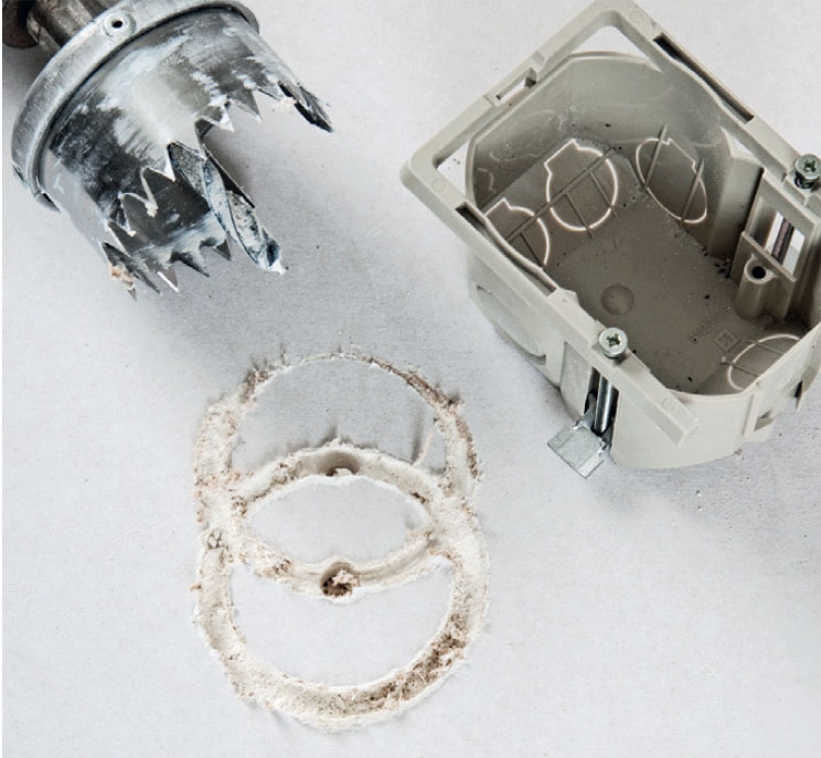 Klipp hull i kantskinnen, hvis du vet at du skal ha strøm i veggen. Klipp hullet før du setter opp skinnen.