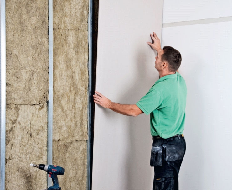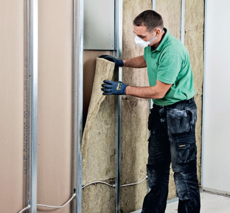 Hulrommet mellom de to gipsveggene fyller vi med mineralull.