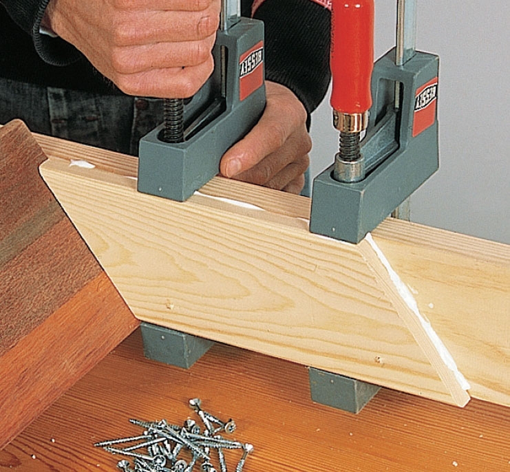 Bor fire hull i avstandsklossen, legg på lim, og hold fast klossen med to tvinger. Press den ned mot trinnet mens den festes med fire 4 x 40 mm skruer.