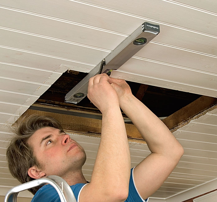 For å skjule sprekkene bruker vi 95 mm brede lister. Det er bedre enn å skifte noen deler av takplatene. Mål og sag alle listene i 45 graders vinkel. Listene monteres med dykkertspiker.