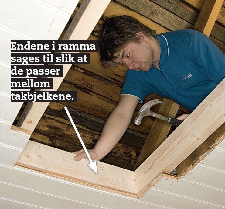 Pass på at ramma blir akkurat passe stor til luka. Er du i tvil, så ta opp luka, og prøv den før du slår i alle spikrene. Ramma klosses opp mellom takbjelkene og festes med kraftige spiker.