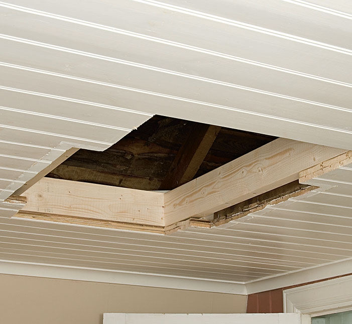 Sjekk at det ikke er elektriske kabler eller noe annet i veien. Pass på at du monterer luka mellom to tak bjelker. Er det umulig, må du sørge for at de blir forsterket. Fjern isolasjonen fra det stedet der du skal sage.