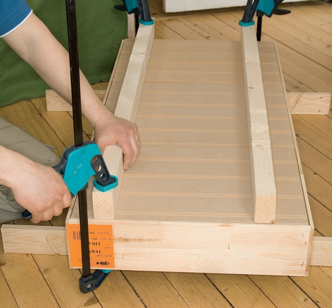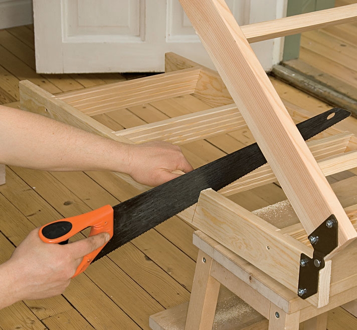Legg stigen på en krakk eller lignende, og kapp stigen etter de markeringene du akkurat har laget. Stigen kan altså tilpasses ulike høyder.