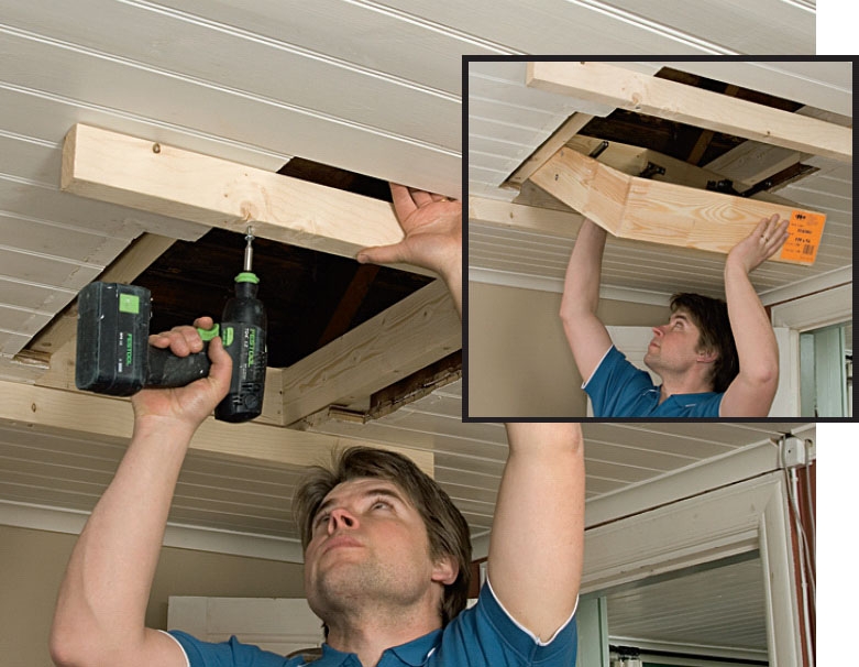 Skru fast to solide lekter på tvers av hullet. Da kan du arbeide med loftsluka ovenfra, og du slipper å måtte ha noen til å holde luka nedenfra. Bor opp til skruene slik at du ikke ødelegger takplatene.