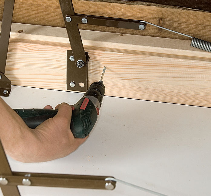 Sett selve stigen fast på luka. På vår modell krever det bare fire skruer, men det kan være forskjell fra trapp til trapp, så sjekk monteringsbeskrivelsen.
